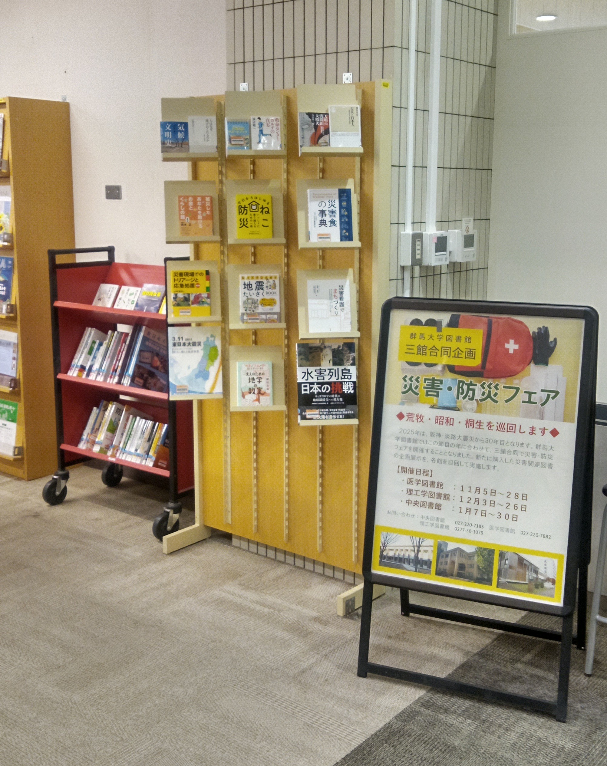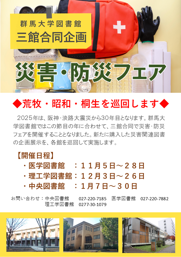 群馬大学図書館では今回,三館合同で災害・防災図書フェアを開催することとなりました。新たに購入した災害関連図書を中心とした企画展示を,各館を巡回して実施します。