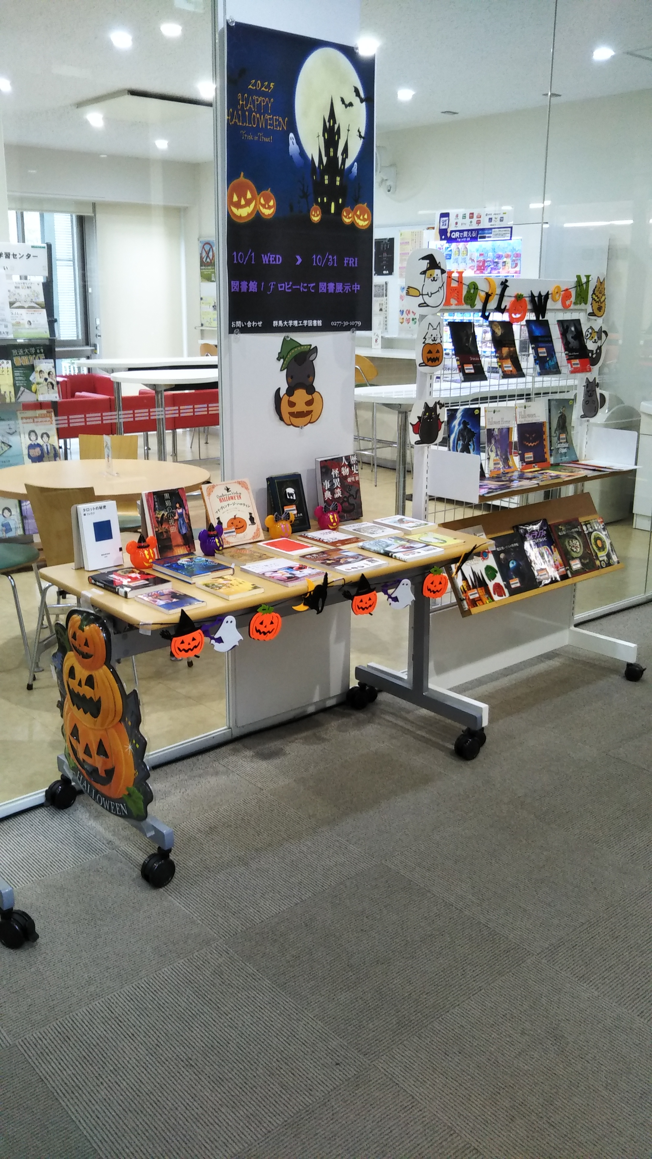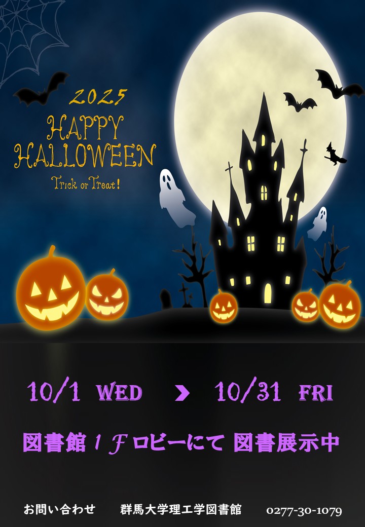 理工学図書館では,ハロウィンに読みたい本の図書を1階ロビーに展示・貸出中です。