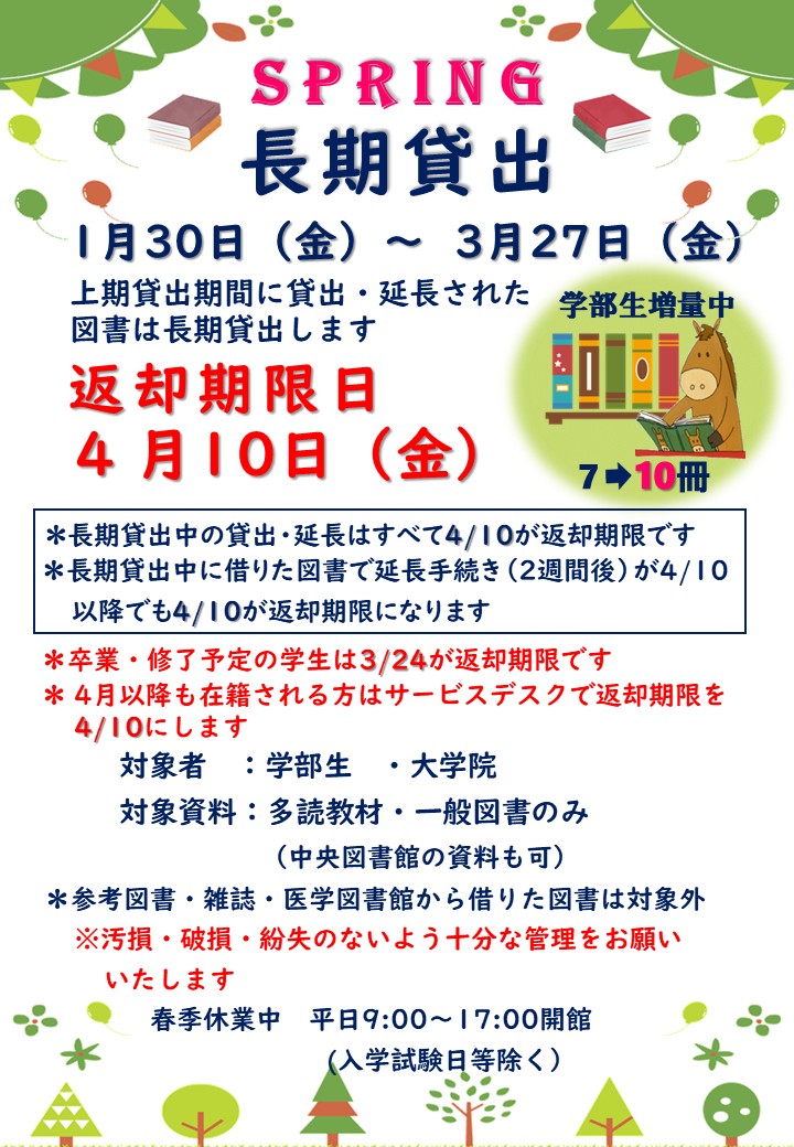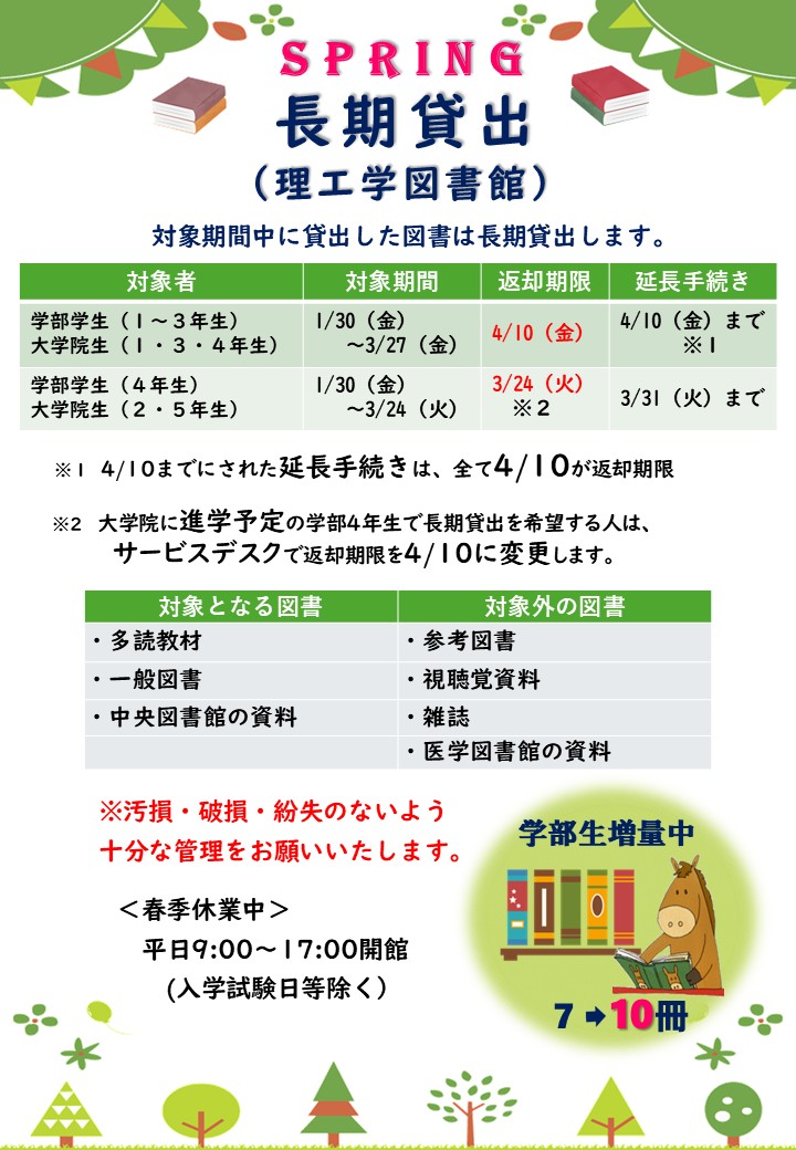 ※3月卒業・修了予定の方の返却期限は3/24(火)です。大学院に進学予定の学部4年生で,長期貸出を希望する人は,サービスデスクにお申し出ください。