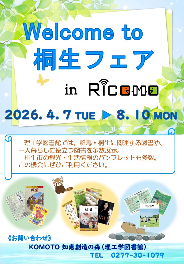 KOMOTO知恵創造の森(理工学図書館)では,1階ラーニングコモンズRicomoにてWelcome to 桐生フェアを開催しています。
