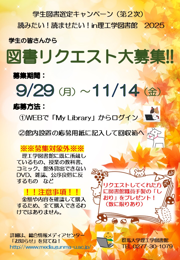 ※他学部学生からの応募も可能ですが,基本的には理工学部学生の希望が優先されます。他学部からのリクエストは中央図書館で随時受け付けておりますので,そちらにご応募ください。